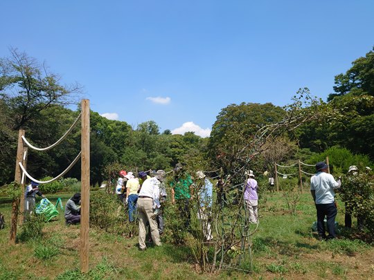 | 8月の作業は夏剪定講習会ということで、日頃の整枝作業のほかに剪定作業が加わります。今月の講師は山崎幹事が担当。講師からは冬の選定とはまた違う剪定の位置や効果について、詳しい解説がありました。 当日はうだるような暑さ、花壇には日除けもないので、木陰で水分補給に努めつつ、40名を超える皆さんが熱心に夏剪定の作業に取り組んでいました。 終了後は恒例の暑気払い会を開催し、参加者一同楽しい時間を過ごしました。